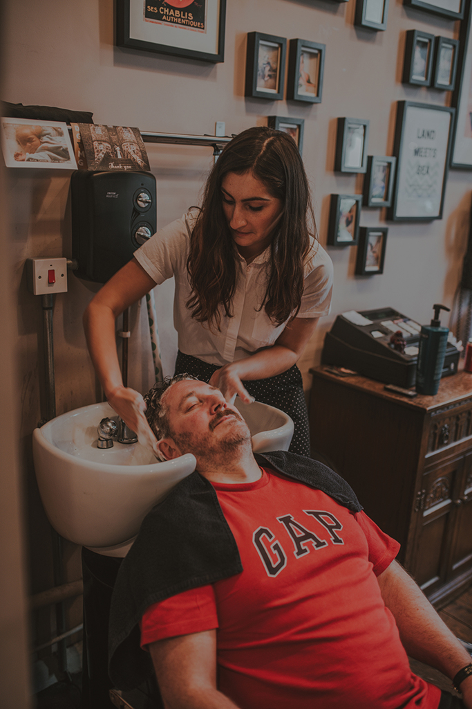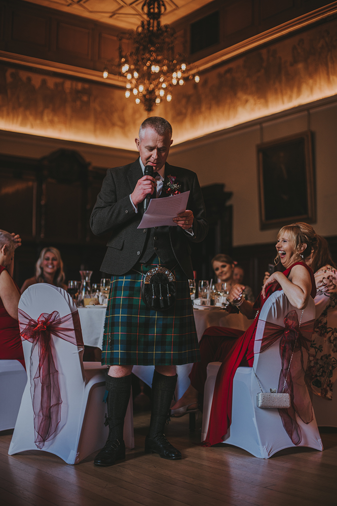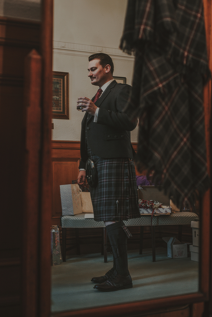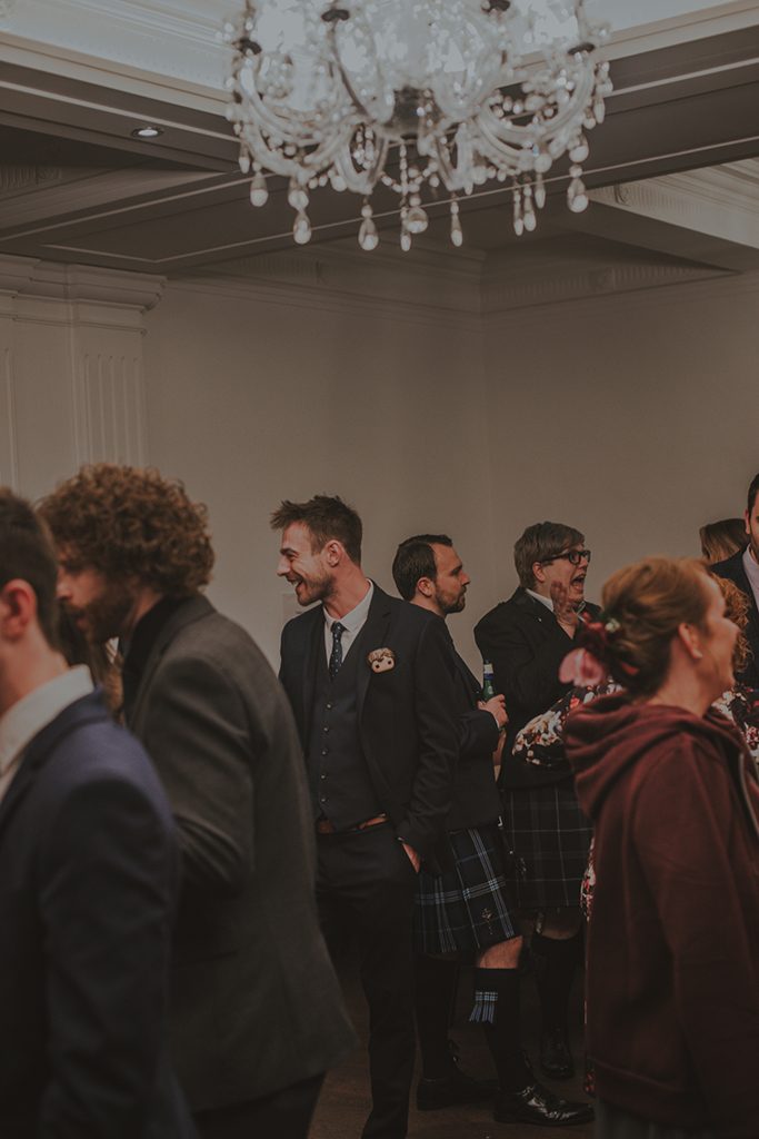 Clearly two gents with an eye for a venue, you'd be hard pressed to find a cooler (or more photogenic!) location for the morning's haircut than Soul Barber Rooms, ️after which we moved onto the main event at the historic Trades Hall of Glasgow. There, in the mahogany panelled walls of the Saloon, the kilted couple - in tears before they'd even reached the white marble fireplace - met to exchange their vows, and quite literally tied the knot in a traditional Celtic handfasting ceremony (with some slightly less traditional fabric choices reflecting one of the groom's enduring love of the The Little Mermaid). In attendance was one very special member of the wedding party: their Bearded Collie, Ianto!